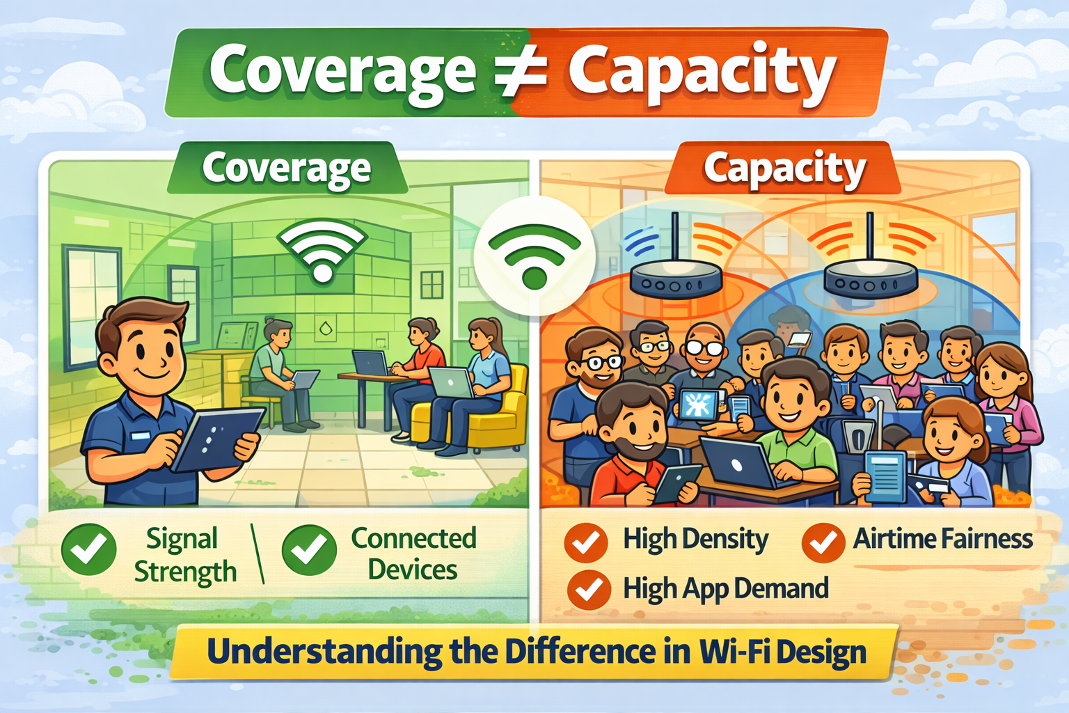 Every Wi-Fi design engineer quickly learns the eternal truth of wireless networking: coverage and capacity are not the same thing. They might sound like twin siblings, but they behave more like cousins who only get along at family reunions. Understanding the difference, and designing for both, is what separates an average Wi-Fi deployment from a user experience meltdown.